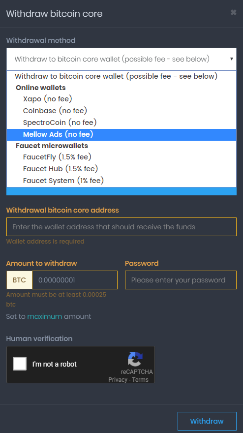 另外Coinpot有限制最低轉出金額,目前的最低轉出金額為25000聰。