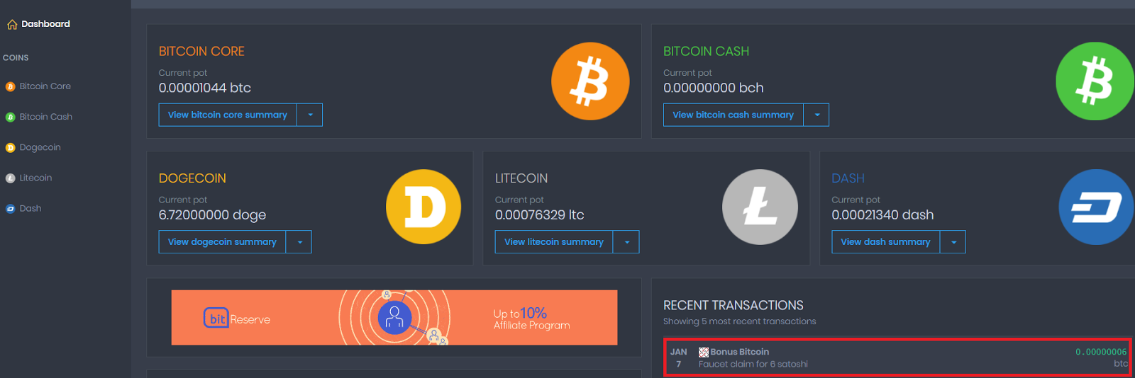 取得的比特幣會自動轉入Coinpot,可以在Coinpot介面的右下角看到從Bonus Bitcoin取得的比特幣!